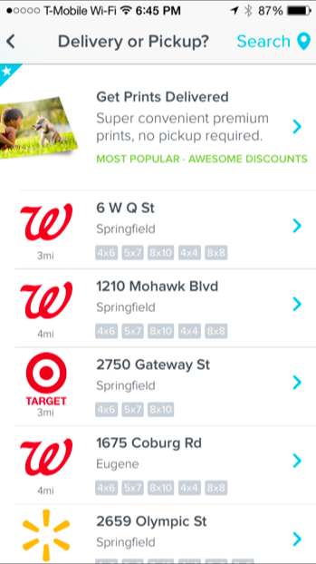 차기 또한이 기능을 제공하여 Walgreens, CVS 및 Target 상점 목록을 통합하여 사진 인화를 주문하고 단일 앱으로 가져올 수 있습니다. 사진을 찍을 수있는 가장 가까운 위치를 쉽게 찾을 수있는 방법입니다.