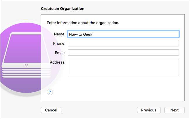 계속하려면 여기에 조직 이름을 입력해야합니다. 이 조직 이름은 기기에 표시되며 기기가 감독되는 '조직'을 나타냅니다. 여기에 원하는 것을 입력하고 "다음"을 클릭하여 계속하십시오. 원하는 경우 조직의 전화 번호, 이메일, 주소를 입력 할 수도 있지만 반드시 입력 할 필요는 없습니다.
