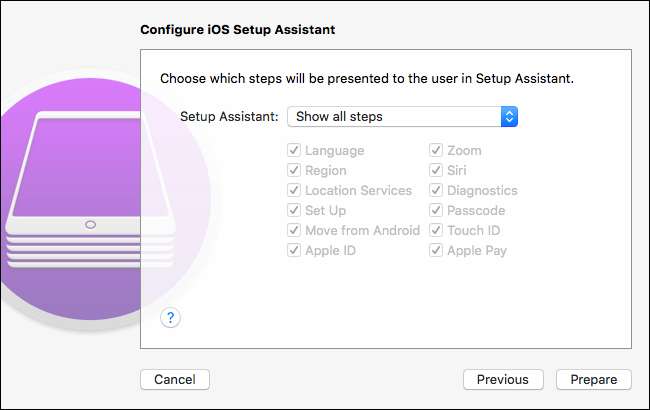 자신의 장치를 감독하고 싶다고 가정하면 "모든 단계 표시"를 활성화 된 상태로 두어 최초 설정 프로세스를 조정하지 않을 수 있습니다. "준비"버튼을 클릭하면 Apple Configurator가 장치를 감독합니다.