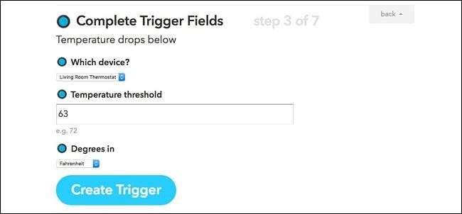 다음 페이지에서 '어떤 기기인가요?'에서 Nest 온도 조절기를 선택하세요. 그런 다음 온도 임계 값을 입력합니다. Nest Thermostat에서이 수치 이상의 실내 온도를 감지하면 알림을 받게됩니다. 또한 "Degrees in"에서 화씨 또는 섭씨를 선택합니다.