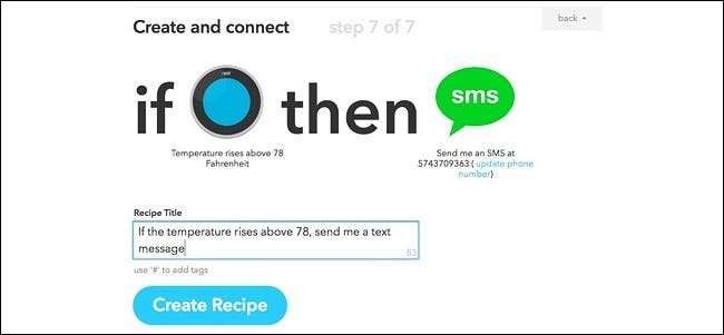 이제 레시피가 적용되었습니다! 이와 유사한 레시피를 만들 수 있지만 겨울에는 실내 온도가 Nest 온도 조절기의 설정 값 이하로 떨어지면 SMS 알림을받을 수 있습니다. 기본적으로 위의 단계를 반복하면되지만 '온도가 위로 상승'을 선택하는 대신 '트리거 선택'페이지에서 '온도가 아래로 떨어짐'을 선택합니다.