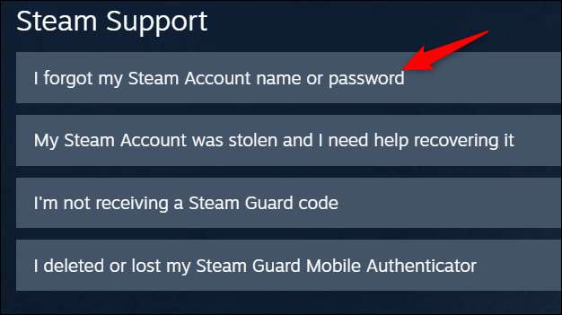 지원 문제 목록에서 "내 Steam 계정 이름 또는 비밀번호를 잊어 버렸습니다"옵션을 클릭하십시오.