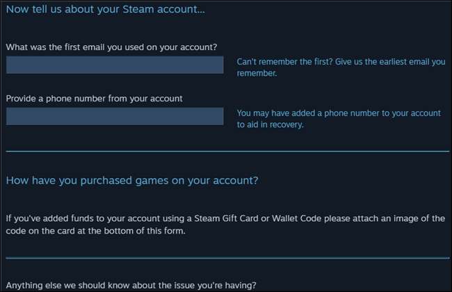 이 경우 계정에 대한 세부 정보가 포함 된 양식을 작성해야합니다. 이러한 필드 중 일부에는 사용한 첫 번째 이메일, 계정에 연결된 전화 번호, 계정에서 게임을 구매하는 방법이 포함됩니다. 이 양식을 제출하면 Steam 지원에서 추가 계정 복구 세부 정보를 알려드립니다.