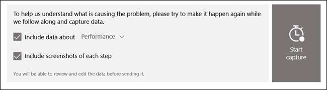 - 문제 재현 : 이 옵션을 사용하면 문제 기록을 캡처 할 수 있습니다. 캡처를 시작한 후 문제 레코더는 레크리에이션 중에 수행 한 각 단계의 스크린 샷을 캡처 한 다음 기록을 문제 보고서에 첨부 할 수 있습니다. 또한 문제 범주에 대한 추가 원격 측정 데이터를 포함 할 수 있습니다.