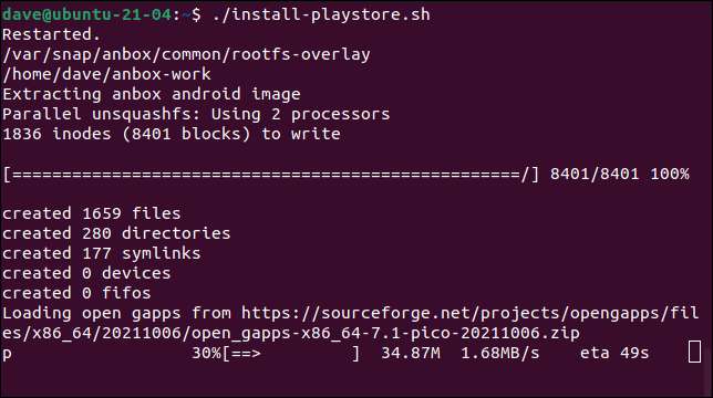 이렇게하면 몇 분이 걸릴 수 있습니다. 설치 중 여러 진행률 막대가 표시됩니다. 아무 것도 일어나지 않을 때 긴 일시 중지도 있습니다. 참을성 있고 스크립트가 결국 종료됩니다.