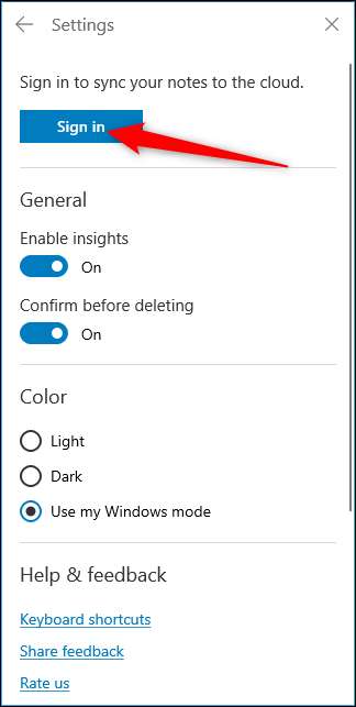 웹을 통해 스티커 메모에 액세스하려면 Microsoft 계정으로 스티커 메모 앱에 로그인해야합니다. 확인하려면 바탕 화면의 스티커 메모 앱 오른쪽 상단에있는 톱니 바퀴 아이콘을 클릭하세요. 로그인하지 않은 경우 창 상단의 "로그인"버튼을 클릭합니다. 스티커 메모 앱은 메모를 Microsoft 계정과 동기화하므로 웹, 다른 Windows 10 PC 및 Android 휴대폰에서 액세스 할 수 있습니다.