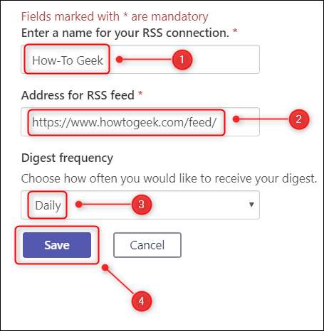 피드의 이름, RSS 피드 링크, 피드를 확인하려는 빈도를 입력하고 마지막으로 "저장"을 선택하십시오.