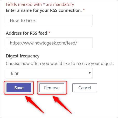 메모: 여러 RSS 피드를 구성한 경우 번호가 하나 이상됩니다.[삼] 원하는 변경 사항을 만들고 "저장"을 클릭하거나 피드를 삭제하려면 "제거"를 선택하십시오. [삼]