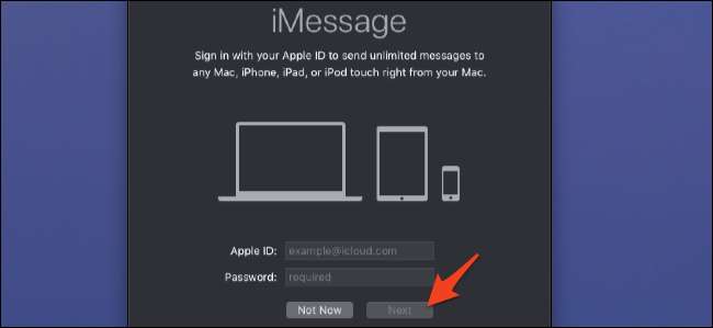 Dock, 응용 프로그램 폴더에서 또는 Command + Space로 검색하여 메시지 앱을 실행하십시오. 앱을 처음 실행하는 경우 로그인하라는 메시지가 표시됩니다. Apple ID가없는 경우 하단의 "새 Apple ID 생성"을 클릭하여 가입 할 수 있습니다. 그렇지 않으면 기존 Apple ID로 로그인하십시오.