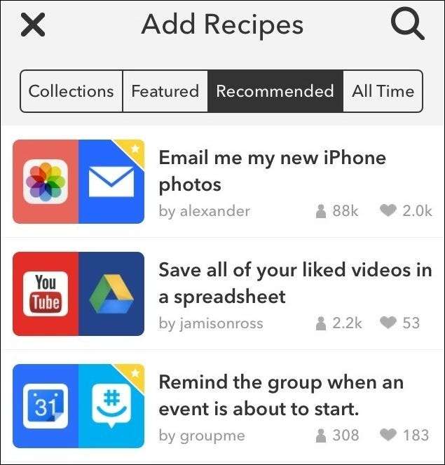 프로그램을 설치하고 무료 계정에 가입 한 후에는 컬렉션, 추천 또는 추천 항목에서 채널별로 미리 만들어진 '레시피'카탈로그를 탐색 할 수 있습니다.