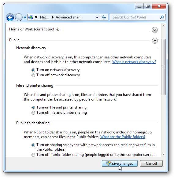 이제 고급 공유 설정에서 네트워크 검색, 파일 및 프린터 공유, 공용 폴더 공유를 켜십시오. 홈 또는 직장 및 공개 프로필 모두에서 활성화되어 있는지 확인하십시오.