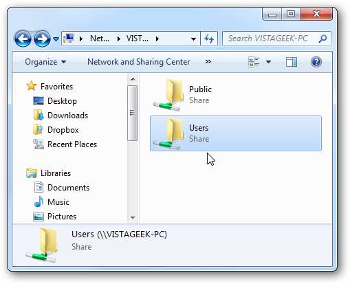 암호 보호가 꺼져 있기 때문에 Vista 컴퓨터에 액세스하기 위해 암호를 입력 할 필요가 없습니다. 그러나 이제는 사용자 공유 폴더를 살펴보고 볼 수 있습니다. 이 예에서는 공용 및 사용자 디렉터리가 모두 공유됩니다.