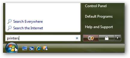 위에서 살펴본 것처럼 Windows 7에 연결된 프린터를 볼 수 있습니다. 연결하여 테스트 문서를 인쇄 할 수 있는지 확인하겠습니다. Vista에서는 시작 메뉴를 클릭하고 검색 상자에 프린터를 입력하고 Enter 키를 누릅니다.