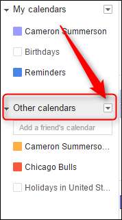 여기에서 왼쪽 열에있는 "기타 캘린더"섹션의 오른쪽에있는 작은 화살표를 클릭하십시오.