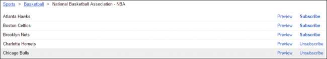 다음 화면에서 팀 이름 옆에있는 "구독"버튼을 클릭하여 팀을 선택할 수 있습니다. 나중에 참고할 수 있도록 여기에서 해당 팀의 시청을 중단 할 경우 구독을 취소 할 수도 있습니다.