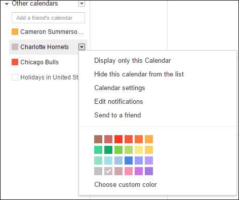 실제로 구독을 취소하지 않고도 각 팀 캘린더를 전환 할 수 있습니다. '기타 캘린더'섹션에서 팀 이름 왼쪽에있는 색상 상자를 클릭하면됩니다. 또한 Google이 잘못 인식 할 경우를 대비하여 팀과 관련된 색상을 맞춤 설정할 수도 있습니다. 그 팀의 자부심을 보여야합니다!