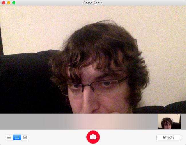 사진 부스의 왼쪽 하단 모서리에있는 아이콘을 사용하여 연속으로 찍은 4 장의 사진 격자, 단일 사진 또는 비디오를 선택합니다. 그런 다음 Photo Booth 창 중앙에있는 빨간색 버튼을 클릭하여 사진을 찍거나 동영상을 녹화 할 수 있습니다. "효과"버튼을 사용하면 사진과 비디오에 필터를 적용 할 수 있습니다.