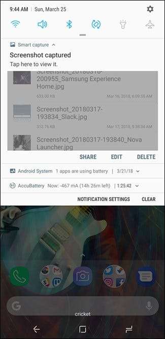 스크린 샷을 방금 찍은 경우 탐색 표시 줄을 아래로 스 와이프하면 스크린 샷에 대한 알림이 표시됩니다. 이미지에 빠르게 액세스하려면 탭하세요. 이 알림에서 직접 스크린 샷을 공유, 편집 또는 삭제할 수도 있습니다.
