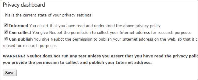 Neubot 인터페이스를 연 후 "개인 정보"탭을 클릭하고 개인 정보 대시 보드에서 옵션을 허용 한 다음 "저장"을 클릭합니다. 이를 통해 Neubot은 연구 목적으로 귀하의 인터넷 주소를 수집하고 웹에 게시 할 수 있습니다. 이 작업을 원하지 않으면 Neubot을 사용할 수 없습니다.