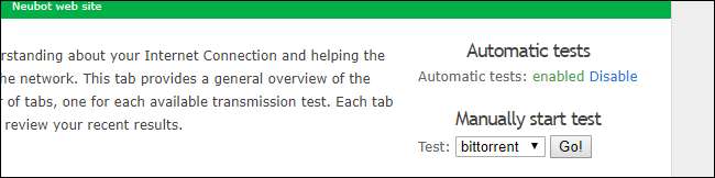 다음으로 테스트 상자에서 "bittorrent"를 선택하고 "이동"을 클릭합니다. Neubot은 BitTorrent 속도 테스트를 수행합니다.
