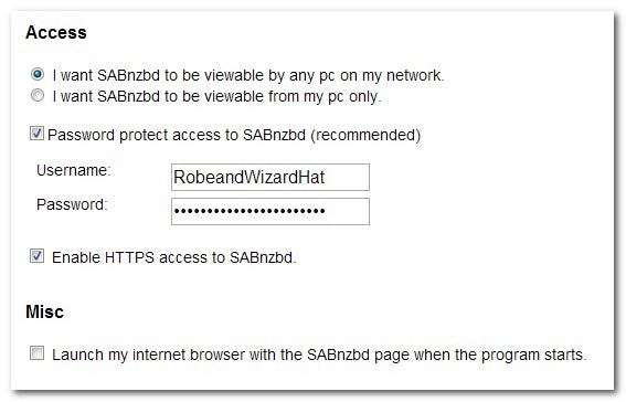 "내 네트워크의 모든 PC에서 내 SABnzbd를 볼 수 있도록합니다"를 선택하고 "프로그램이 시작될 때 SABnzbd 페이지로 인터넷 브라우저 실행"을 선택 취소하는 것이 중요합니다. SABnzbd 구성을 마치면 헤드리스 박스가 될 것이며 Pi에서 기본 브라우저를 시작하고 시스템 리소스를 씹을 이유가 없습니다. 사용자 이름 / 암호 설정은 선택 사항입니다.