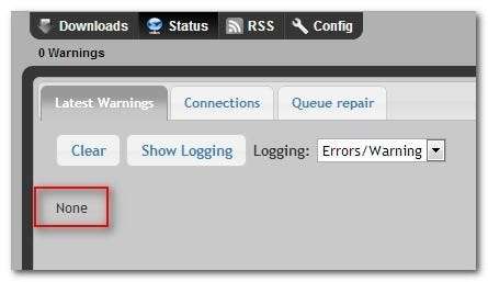 이제 SABnzbd에서 오류를 지울 때입니다. 옵션-> 다시 시작을 클릭하여 WebUI 내에서 SABnzbd를 다시 시작하십시오. 다시 시작할 때 WebUI의 왼쪽 상단 영역에서 오류 메시지가 사라져야합니다. 왼쪽 상단에있는 상태 링크를 클릭하여 오류 로그가 비어 있는지 다시 확인할 수 있습니다.