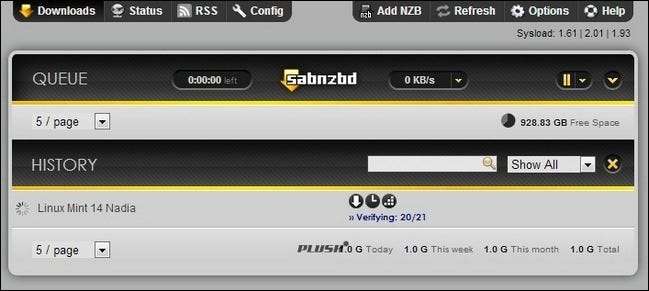 SABnzbd가 다시 시작되면 다시 시도해 볼 시간입니다. 테스트를 위해 우리는 Binsearch.info 및 Linux Mint 사본 발견 다운로드. 다운로드를 시작하기 위해 .NZB 파일을 SABnzbd가 SABnzbd / watch / 폴더에 덤프했습니다. 위의 스크린 샷에서 볼 수 있듯이 다운로드에서 확인 및 압축 해제로 이동함에 따라 대기열에 나타난 다음 WebUI의 기록 섹션으로 전송됩니다.