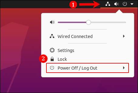 상태 메뉴의 아무 곳이나 클릭하십시오 (네트워크, 오디오 및 전원 아이콘이 표시됩니다). 나타나는 드롭 다운 메뉴에서 "전원 끄기 / 로그 아웃"을 클릭하십시오.