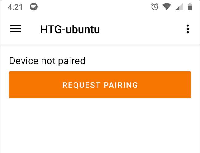 두 장치에서 설치가 완료되면 Android 앱의 메뉴 버튼을 눌러 "새 장치 페어"를 선택하여 짝이 있습니다. Ubuntu PC가 나열되어있는 것을 보시고 그것을 살짝 누르고 "요청 페어링"을 누릅니다.