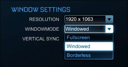 Rocket League 및 Borderlands 2를 비롯한 많은 게임에는 '테두리없는 창'모드로 게임을 실행할 수있는 옵션도 있습니다. 즉, 게임이 창에서 실행되지만 창 크롬 (테두리, 최대화 및 최소화 버튼, 기타.). 이 기능은 게임이 전체 화면에서 변덕스럽고 정기적으로 데스크톱에 액세스해야하는 경우 유용합니다. 보기 전체 화면과 비슷하지만 행위 창문처럼.
