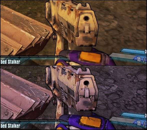 첫 번째 항목은 텍스처 디테일 . 텍스처는 아이템 자체의 모양이 아니라 게임 아이템의 실제 색상과 세부 사항입니다. Borderlands 2와 같은 게임에서 텍스처 품질은 총 표면의 세부 사항이 낮음 (위)에서 높음 (아래)으로 현저하게 개선되었음을 보여줍니다. 분명히 더 높은 디테일은 그래픽 카드에서 더 많은 것을 요구합니다.