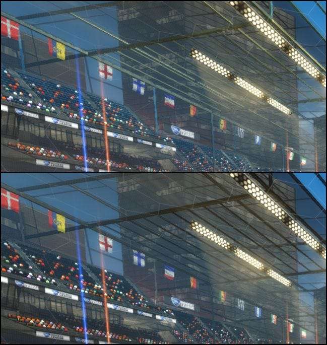 다음 이미지에서 차이점을 쉽게 알 수 있습니다. 상단은 앤티 앨리어싱이 적용된 상태 (FXAA High)와 앤티 앨리어싱이 완전히 꺼진 상태의 모습을 보여줍니다.