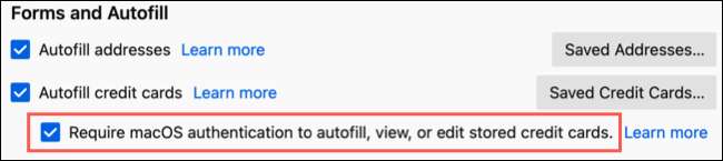 유용한 설정이 있습니다 인증이 필요합니다 신용 카드 정보를 자동으로 채우기 위해서. 이 기능은 Windows 및 MacOS에서 사용할 수 있습니다. 상자를 인증하려면 상자를 선택하면 컴퓨터 암호를 입력하라는 메시지가 표시됩니다. 귀하의 신용 카드에 대한 자동 필링 옵션 ...에