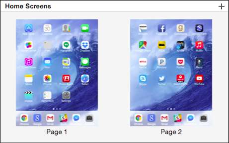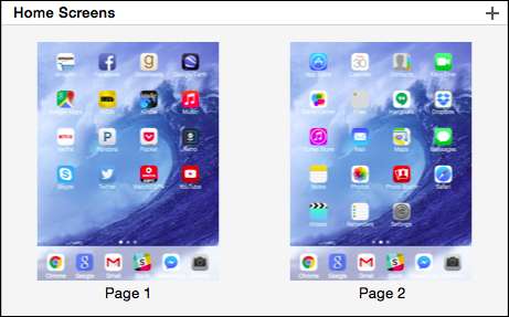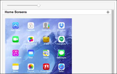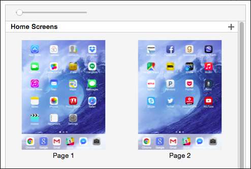 오른쪽에는 "홈 화면"섹션이 있으며 여기에서 iTunes 앱 관리의 진정한 마법이 발생합니다. 먼저 상단의 슬라이더를 사용하여 홈 화면을 확대하거나 축소 할 수 있습니다. 왼쪽으로 슬라이드하면 나란히 배열 된 홈 화면 ( "페이지라고 함)을 볼 수 있습니다.