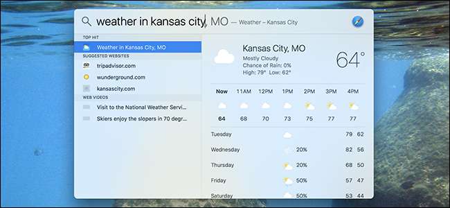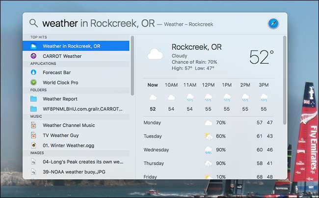 지금까지 Spotlight의 로컬 기능에 중점을 두었지만 많은 인터넷 콘텐츠도 제공합니다. 예를 들어 날씨를 원하는 경우 "날씨"를 입력하면됩니다.