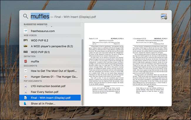 검색은 파일 이름을 확인하지만 문서의 경우 Spotlight는 파일 내부도 확인합니다. 예를 들어, 대학에 돌아와서 저는 Muffles라는 고양이가 "작은"패러디 출판물을 출판하는 것을 도왔습니다. 몇 년 후 Spotlight에서 "Muffles"를 검색하면 파일 이름에 "muffles"가 없더라도 문서가 나타납니다.