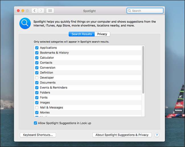 이러한 인터넷 결과 나 특정 범주의 결과를 좋아하지 않을 수도 있습니다. 문제 없습니다. 시스템 환경 설정을 열고 Spotlight 섹션으로 이동하십시오. 여기에서 모든 범주의 결과를 비활성화 할 수 있습니다.