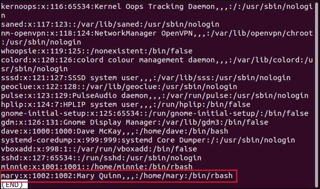 우리는 사용자 메리가 다음 로그인 할 때 사용자 메리가 제한된 쉘을 사용할 것을 볼 수 있습니다.