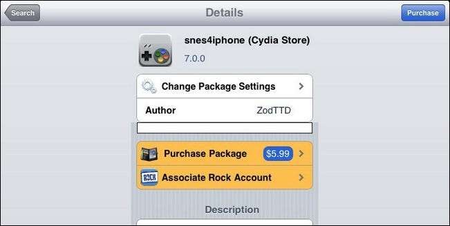 필요한 장비 (모든 중요한 탈옥 장치 포함)를 확보했으면 시작할 준비가 된 것입니다. iPad에서 Cydia를 열고 하단 도구 모음에서 검색 버튼을 클릭합니다. 검색 snes4iphone . 항목을 클릭하면 위의 스크린 샷과 매우 유사한 내용이 표시됩니다. 클릭 매수 사본을 구입합니다 ($ 5.99). PayPal 또는 Amazon Payments를 사용하여 결제 할 수 있습니다.