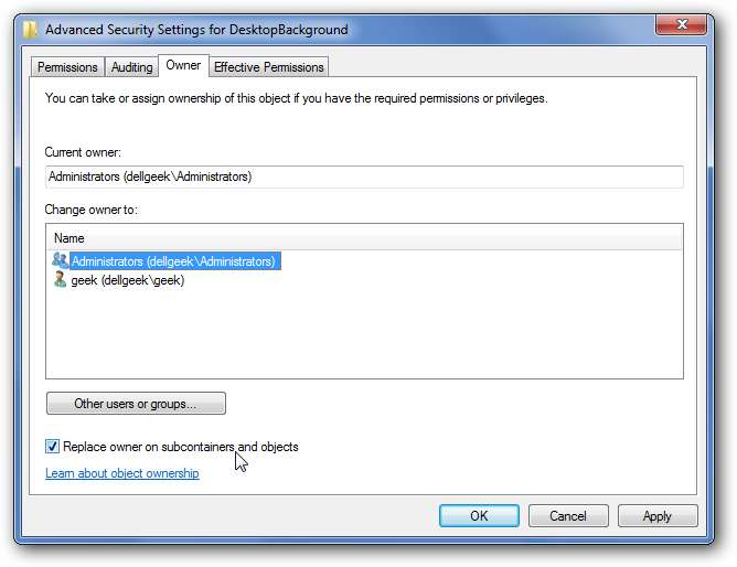 소유자 탭으로 이동하여 목록에서 관리자를 클릭 한 다음 "하위 컨테이너 및 개체의 소유자 교체"확인란을 선택합니다.