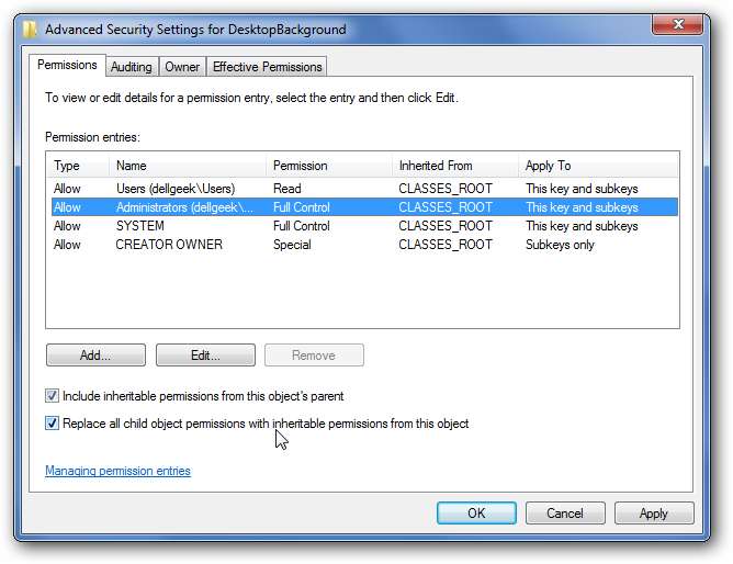 이제 사용 권한 탭으로 돌아가서 목록에서 관리자 (이미 모든 권한으로 표시되어야 함)를 선택하고 "이 개체에서 상속 가능한 사용 권한으로 모든 자식 개체 사용 권한 바꾸기"확인란을 선택합니다.