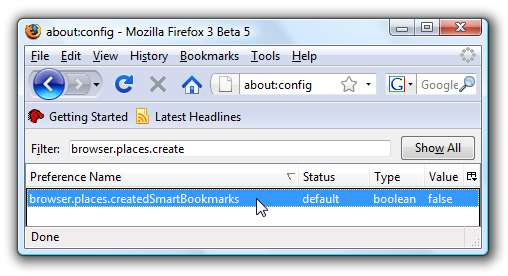 기본값이 true 인 목록에 단일 항목이 표시되어야합니다. 두 번 클릭하여 값을 false로 설정하고 Firefox를 다시 시작하면 Smart Bookmarks 폴더가 돌아 왔습니다.