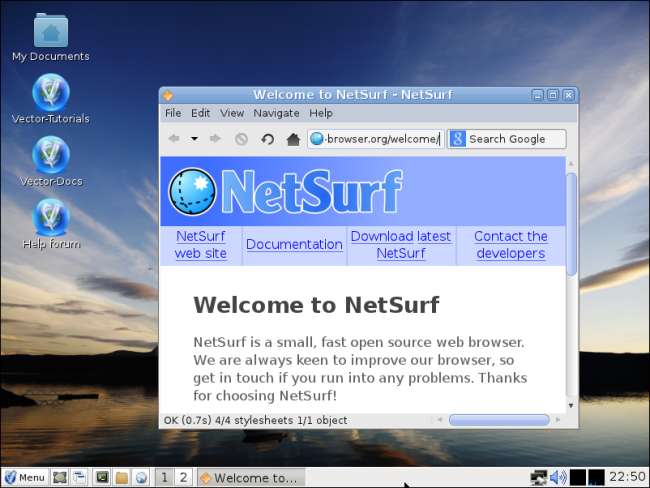 VectorLinux Light는 Vector Linux의 경량 버전입니다. 개발자들은 256MB의 메모리를 가진 시스템에서 잘 작동한다고 주장합니다. 대신 Barebone 옵션을 설치할 수도 있습니다. 개발자가 128MB의 메모리를 가진 Pentium 3에서도 잘 작동한다고 말하는 그래픽 웹 브라우저를 제공합니다.