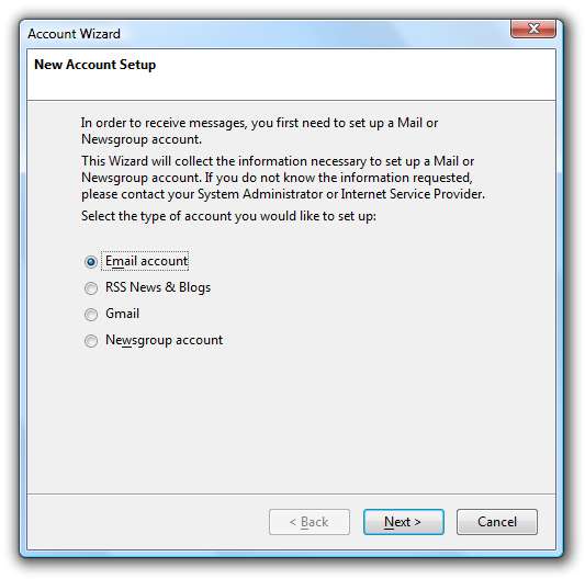 Thunderbird를 열고 도구 \ 계정 설정으로 이동하여 계정 추가 버튼을 클릭하십시오. 결과 마법사에서 이메일 계정을 선택합니다.
