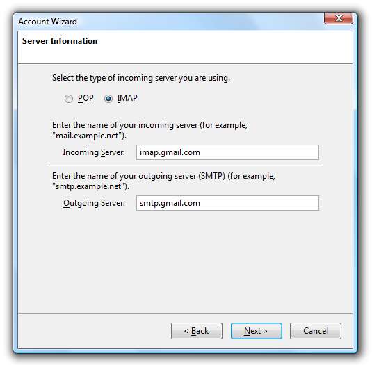 최신 정보: 이 대화 상자는 기본적으로 Gmail을 옵션으로 지원하지만 Gmail 호스팅 앱 계정에서는 작동하지 않는 Thunderbird 버전 2.0에서 가져온 것이므로 몇 가지 단계를 더 수행해야합니다. 일반 Gmail을 사용하는 경우 해당 옵션을 사용하고 "보낸 메시지 / 초안 메시지 동기화"로 건너 뛸 수 있습니다.