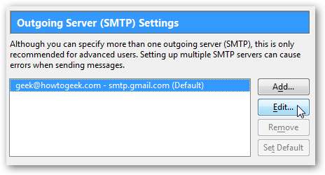 왼쪽 창에서 "보내는 서버"를 선택한 다음 Gmail 계정 옆에있는 편집 버튼을 클릭합니다.