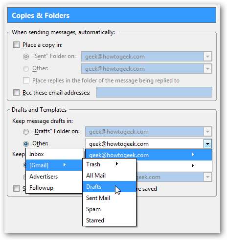 Thunderbird에서 보낸 메일이나 초안을 Gmail에서 사용할 수 있는지 확인하려면 계정 설정의 왼쪽 창에서 "사본 및 폴더"옵션을 선택하십시오.