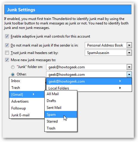 Thunderbird에서 정크로 표시된 메시지를 Gmail 스팸 폴더로 푸시하려면 왼쪽 창에서 "정크 설정"항목을 선택한 다음 "새 정크 메시지 이동 위치"확인란을 선택해야합니다.