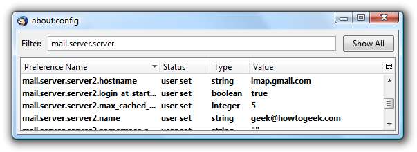 이제 Gmail 계정의 "숫자"가 무엇인지 알아 내기 위해 조사를해야합니다. 필터링 기준 mail.server.server 그런 다음 목록에 IMAP 계정이 표시 될 때까지 아래로 스크롤 한 다음 키가 "mail.server.server2"또는 다른 번호로 시작하는지 확인합니다.