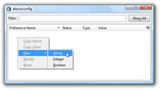 목록 상자의 아무 곳이나 마우스 오른쪽 버튼으로 클릭하고 New \ String을 선택합니다.